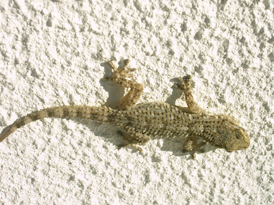 Animal que não goza de grande simpatia, pelo seu aspecto pouco atraente, a verdade é que a osga ou osga doméstica (hemidactylus frenatus) é um réptil com a capacidade extraordinária de se deslocar em paredes, na vertical, incluindo em superfícies lisas, capacidade que tem sido objecto de vários estudos científicos. Como nota pessoal acrescentaria que a osga tem um olhar gentil. Para as moscas e outros insectos é que não será tanto assim. É animal frequente em Portugal e gosta de nos visitar na nossa própria casa. O exemplar da fotografia é ainda um juvenil.